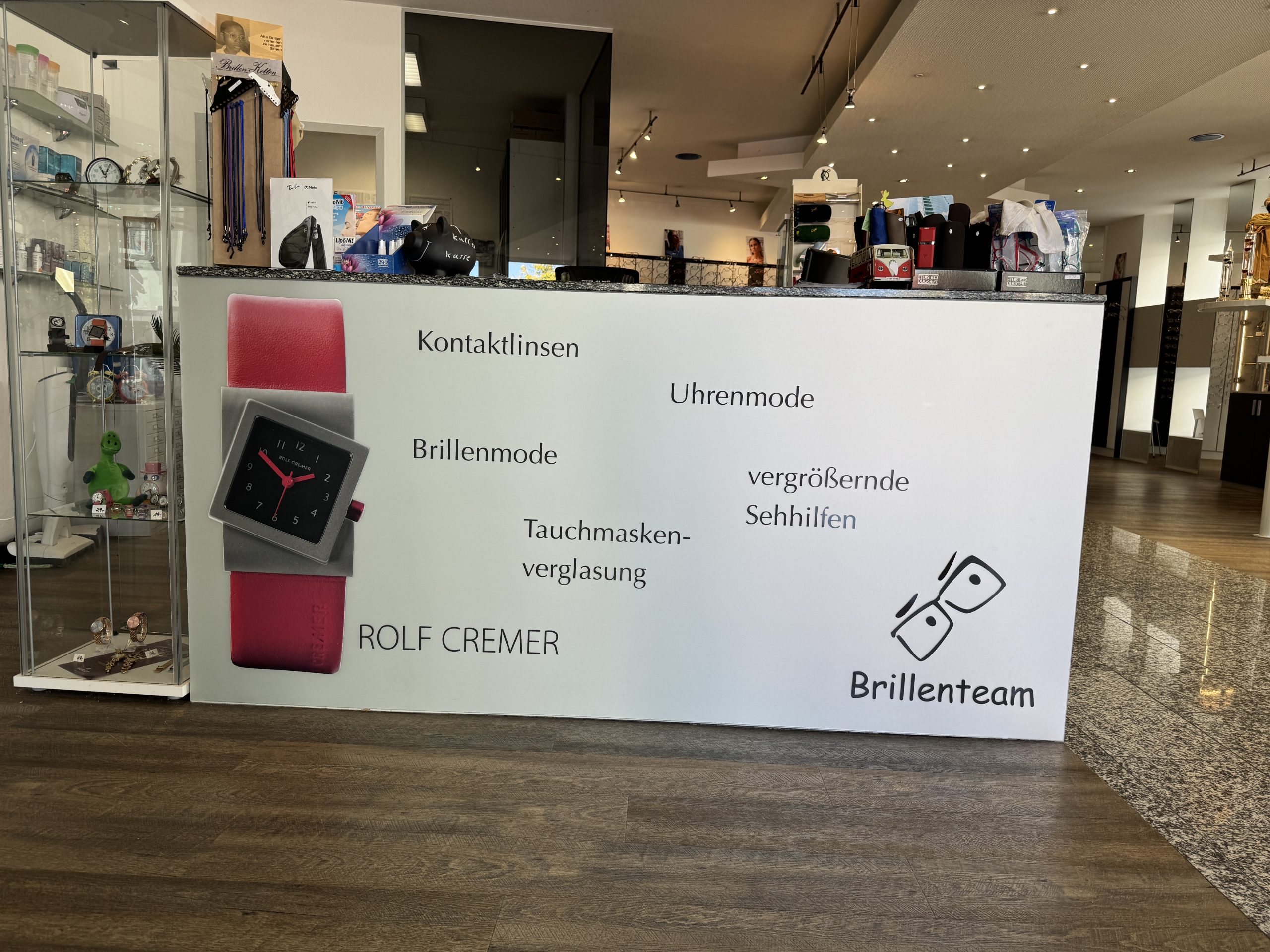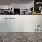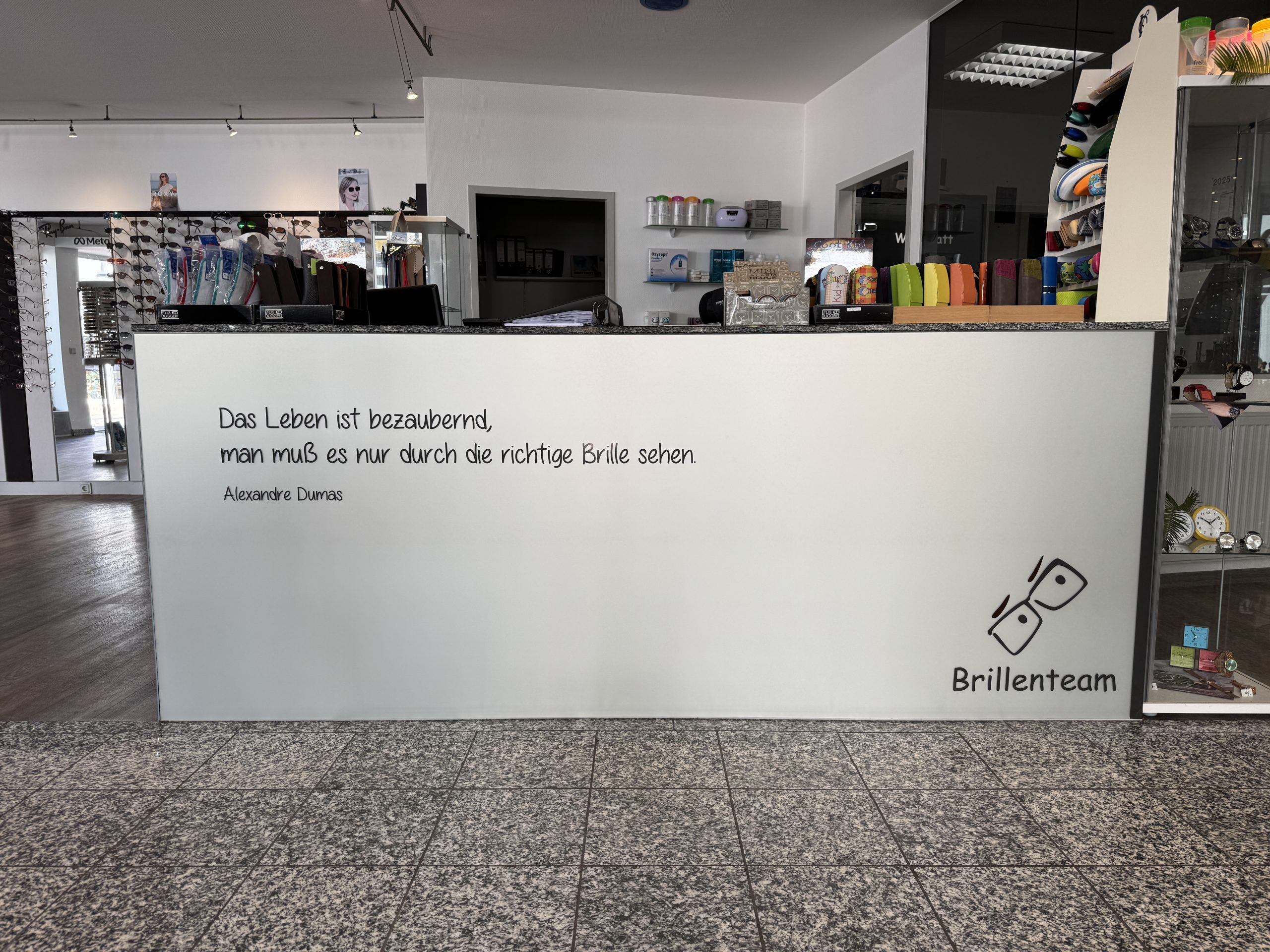 Aus einer schlichten Theke wurde ein stilvoller Hingucker für ein modernes Brillengeschäft. Die einst spiegelnde Front erhielt ein neues Gesicht – veredelt mit einer elegant satinierten milchweißen Folie und einem hochwertigen Digitaldruck, der Atmosphäre und Markenidentität perfekt vereint.