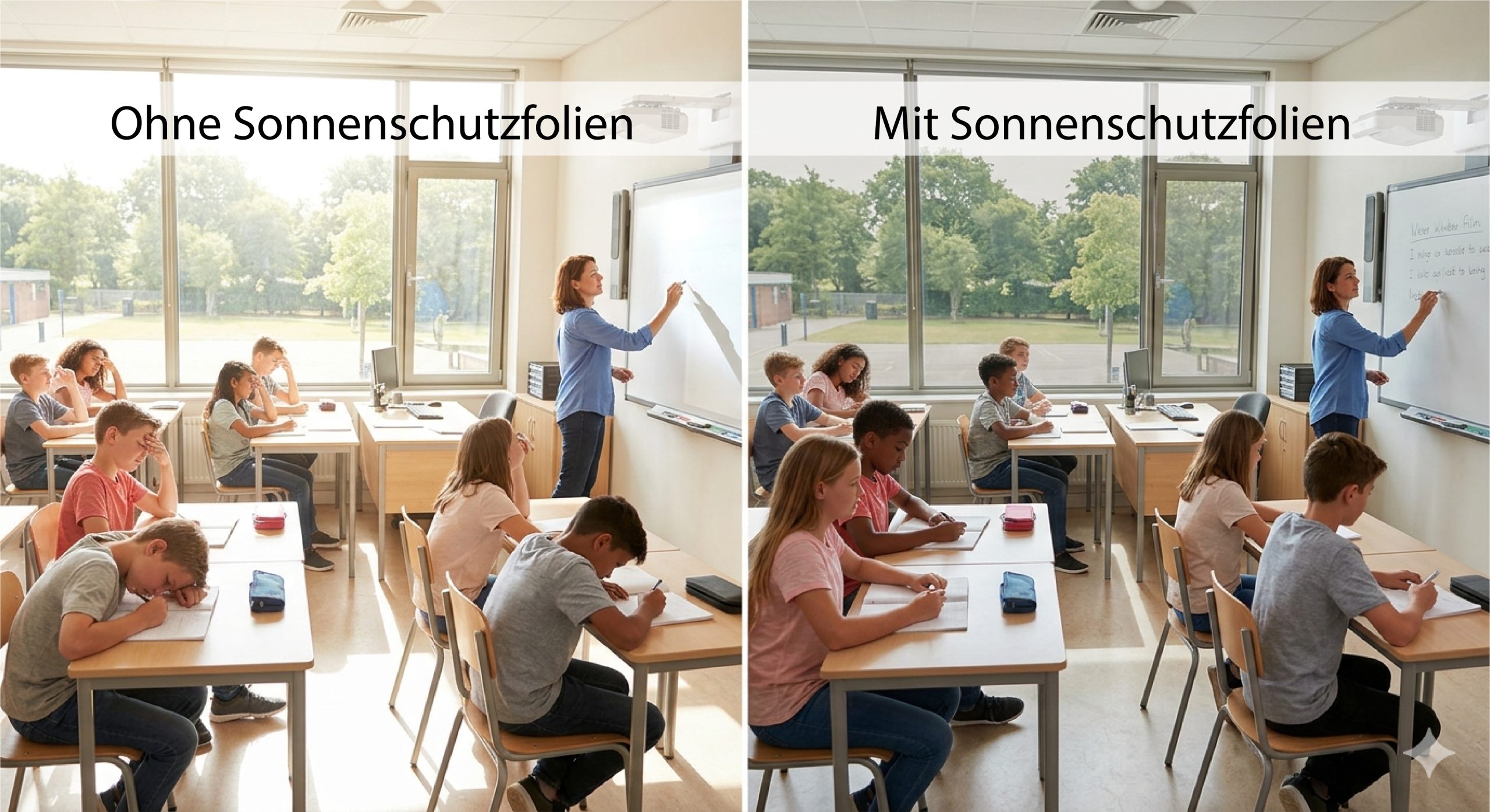 In Klassenräumen, Gruppenräumen und Hörsälen führen große Fensterflächen häufig zu starker Hitze und blendendem Sonnenlicht. Gerade im Sommer wird konzentriertes Lernen dadurch deutlich erschwert.